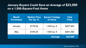 So, how much less are we talking? Here’s a look at the numbers. According to the last full year of data, for the typical 1,500 square foot house, buyers who closed on their home in January paid around $23,000 less compared to those who bought in May. And that general trend typically holds true each year (see chart below):